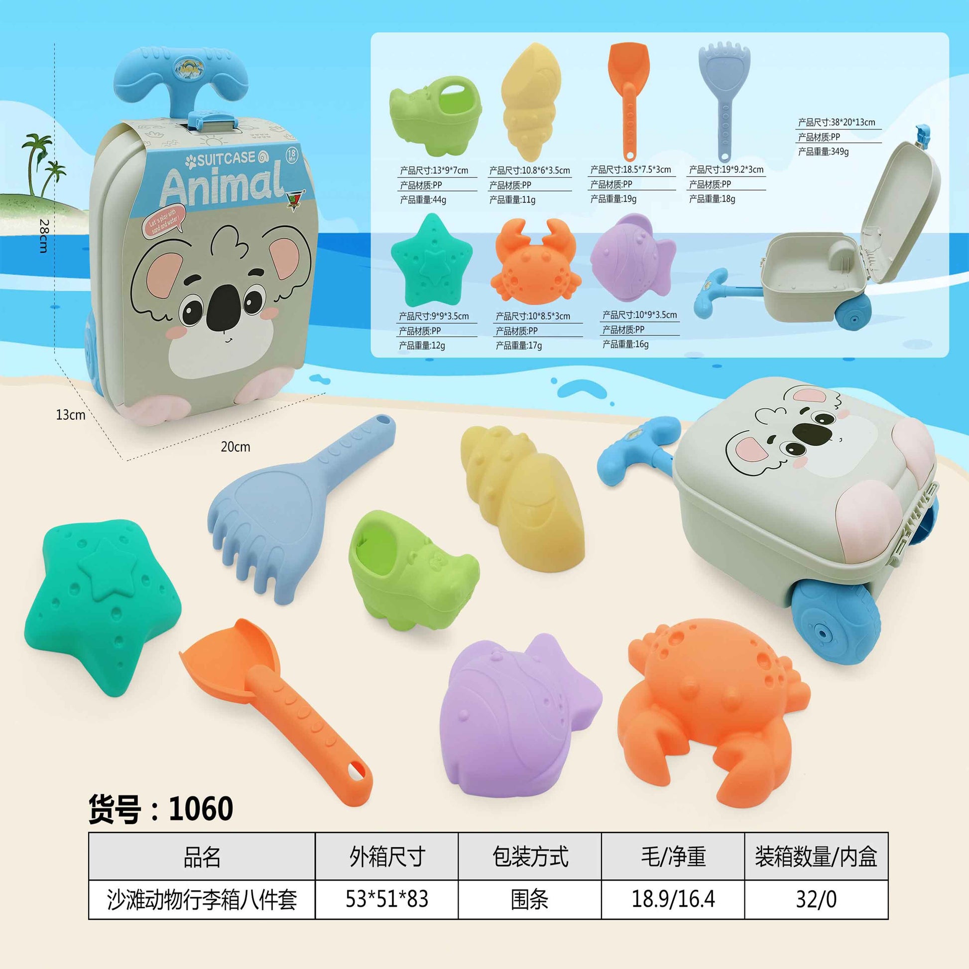 Make beach days easier (and tidier) with this Koala Sand Toy Suitcase Trolley Set (8 pcs). Kids get a fun animal suitcase with wheels, plus the essential tools for building and shaping sand. After playtime, everything packs back into the suitcase for quick storage and easy carrying.